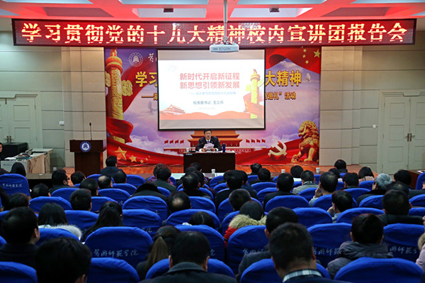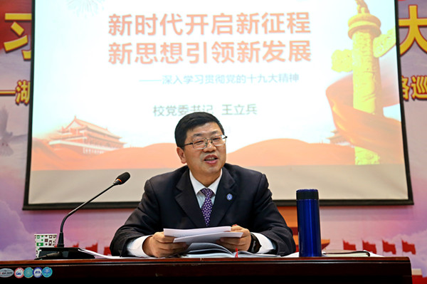 测试结束后,王立兵以“新时代开启新征程,新思想引领新发展”为主题,围绕“党的十九大概况”、“准确把握十九大精神”和“贯彻落实十九大精神,促进学校快速发展的几点思考”三个方面展开宣讲。他指出,贯彻落实十九大精神,就是要坚持以习近平新时代中国特色社会主义思想为指导,围绕“两个一百年”奋斗目标和“两个阶段”战略安排,坚持全面从严治党,坚持“四个服务”,坚持特色发展,不忘初心,牢记使命,砥砺前行,努力在新时代高等教育奋进的新征程上,树立新形象,展示新作为。他强调,一是要坚持和完善党委领导下的校长负责制,落实新时代关于全面从严治党的新要求。二是要坚持社会主义办学方向,加强和改进学校思想政治工作。三是要坚持内涵发展,加强高水平综合性应用型大学和一流学科建设步伐。四是要扎实做好当前重点工作。他强调,要用发展的眼光看待问题,用发展的思路分析问题,用发展的成果解决问题。要精准推进转型发展,要把特色做特做强,要全力做好安全稳定工作,要总结好今年工作,要谋划好明年工作。王立兵还传达了省纪委《关于2018年元旦春节期间进一步严明纪律加强作风建设的通知》,传达了黄冈市委五届六次全会和全市经济工作会议精神。