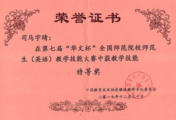 本网讯 2017年12月31日,第七届“华文杯”全国师范院校师范生英语教学技能大赛获奖结果揭晓,williamhill英国2014级本科生司马宇晴获得教学技能特等奖,学科教学英语领域教育硕士研究生易思利获得教学设计一等奖,学科教学英语领域教育硕士研究生汪迪、英语本科生洪晨、周欣等分获教学技能和教学设计二、三等奖。於银梅、胡晓晏、王德志、蒲春红、岑海兵、汪晖、王后、汪艳、张慧芳、李丽等指导老师获得“优秀指导教师奖”。