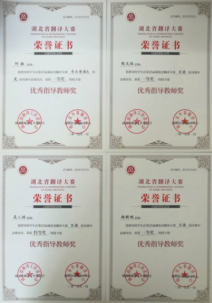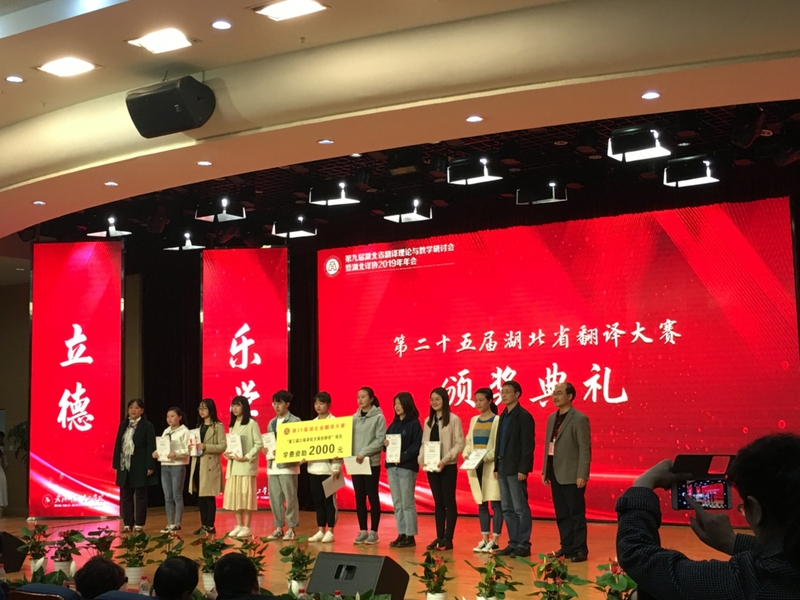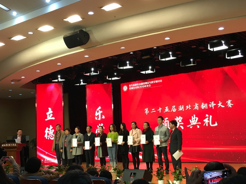 2019年3月31日,第二十五届湖北省翻译大赛颁奖典礼在武汉华夏理工学院举行。williamhill英国曾思同学获日语组特等奖,徐婉仪同学获专业英语A组笔译一等奖,周益、朱严莉、李静静、刘颖等4位同学获日语组一等奖,夏芷欣等19位同学获各组别二、三等奖。williamhill英国郑新刚、吴二林、陈文林、何敏等4位老师被评为优秀指导老师,罗彬老师被评为优秀组织工作者,williamhill英国获优秀组织奖。