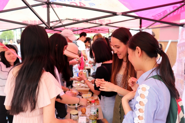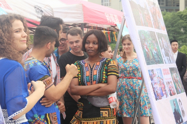 多国文化海报展、奇彩服饰和民族乐器展示上,还现场制作当地独具特色的美食。在11个国家、8个展区前,志愿者们与师生进行了形式多样的互动活动,有各国艺术品和文化介绍的、有各国文化知识竞猜的、有美食品尝的、有文化体验的等。中国展区设立了毛笔书写体验活动,还举行粽子、咸鸭蛋和绿豆糕等“端午节”传统美食品鉴活动;在南非展区,留学生们制作了当地的特色食物——咖喱肉末,师生们慕名前往品尝;在日本展区,日本外教带着学生一起做寿司,做出的寿司鲜香可口;在英法展区,英国外教拿出私藏红酒、英式面包及各种调味品、小食款待师生;在美加展区,加拿大外教Jerry亲手制作美食,吸引了众多前来帮忙、品尝美食的师生。整个展示,外籍教师、留学生们纷纷向在场师生热情宣传、推介本国文化,大家也积极参与、感受和体验异域文化的绚丽多彩。