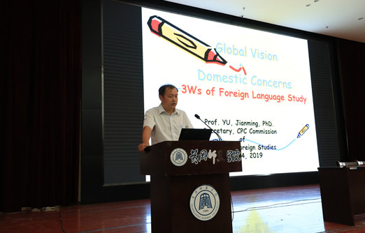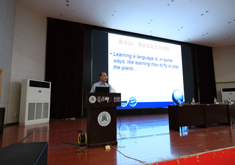 学院党委书记余健明教授用英文作了主题为《国际视野和本土情怀——外语学习的三个“W”》的报告,余书记从为什么学外语、外语专业的就业方向是什么以及怎样学外语三个问题入手,对我们外院的学生提出了高要求:作为一名外语学习者,我们应具备国际视野和本土情怀。