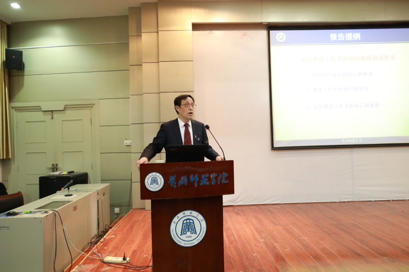 彭锦以一个党员教育工作者的视角,从三个维度深刻论述了“守初心,担使命”的主题,精辟阐释了什么是党员教育工作者的初心和使命。他指出,党员教育工作者的初心和使命是立德树人,为国家和民族培养德智体美劳全面发展的社会主义建设者和接班人。初心和使命是党员教育工作者立德树人的立身之本、不断前进的动力之源和干事创业的成事之基。争做“四有”好老师是每一个党员教育工作者毕生的追求和目标。最后,彭锦结合我校“申硕更名”的目标,对每一个党员教育工作者提出坚守初心,勇担使命的明确要求。