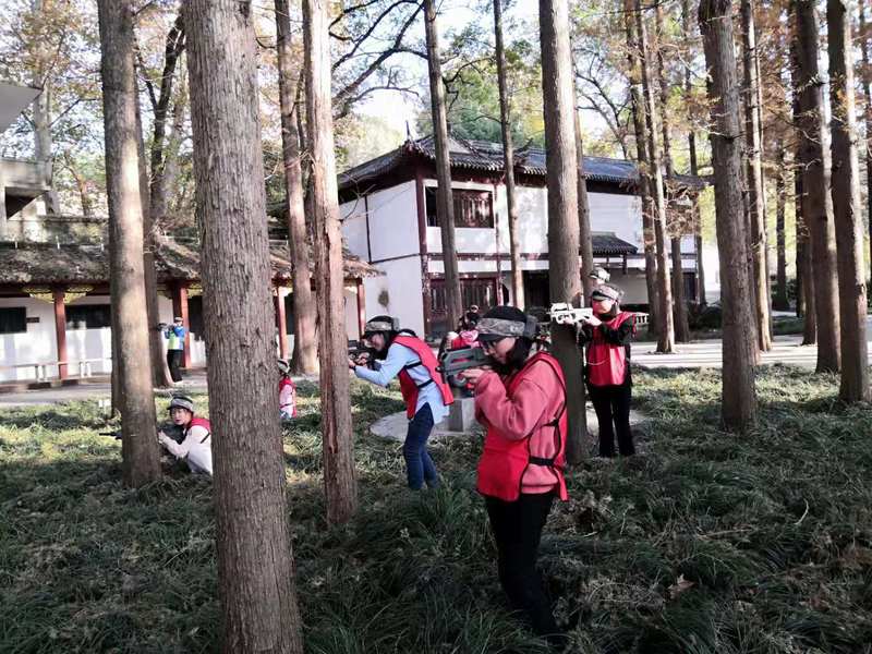 拓展活动中,所有师生被分成了四队,他们分别是“战狼队”、“绿巨人队”、“红太狼队”、“龙腾虎跃队”。第一个游戏是“合力构建”,需要所有队员合力拉起绳子绑住易拉罐并带到目的地,同学们紧盯绳子,神情紧张,口中喊着一致的口号将物品运送到终点;第二个游戏是“一通到底”,所有队员手拉手通过圆环,最先通过的队伍获胜。同学们矫健灵活,齐心协力,都取得了不错的成绩;第三个游戏是“圆环开锁”,所有队员背对着并手拉手,最先在手不断的情况下转成面对面圆环的队伍获胜。比赛场面非常精彩,各方都使出了浑身解数。 “红太狼队”首先用两种方法解开了绳子,引得在场师生们的热烈掌声;最后进行的游戏是“真人CS”,老师和同学们姿势标准,目视前方敌队,“命中”“阵亡”声在森林里此起彼伏,战况十分激烈。
