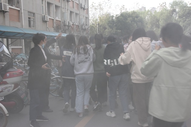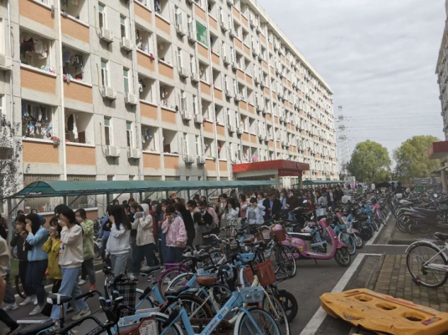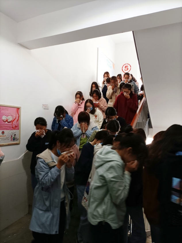 三声哨响,房门立刻被敲响,各楼层负责人安排在寝学生进行安全有序撤离。