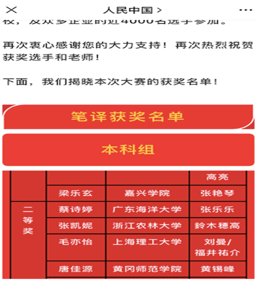 本次大赛由《人民中国》杂志社和教育部外指委日语分委员会联合主办,广东省翻译协会和广州市联普翻译有限公司共同承办;来自国内和日本500多所高校、企业单位的近4000名选手参加本次比赛。在黄锡锋老师的指导下,唐佳源同学数易其稿,精益求精,经过激烈角逐,获得了喜人成绩。