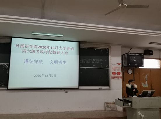在A01会场,辅导员刘晚秋老师解读了《刑法修正案(九)》中作弊罪和替考罪,告诫外院学子组织作弊、替考或委托他人替考都构成犯罪,不要触碰考试的法律底线,以免自毁前程,强调了大学英语四六级考试纪律的严肃性。党委副书记夏小环做考风考纪教育时,强调了《williamhill英国中文关于严肃考试纪律加强考风建设的若干规定》中的考试违规行为的认定与处理办法,再次督促全体考生要自觉遵守考试纪律,诚信考试,坚决杜绝考试违纪或作弊行为,并结合学校常态化疫情防控管理,要求全体考生继续做好个人防护,坚持考前十四天健康状况监测。最后,夏书记建议大家要放松心态,沉着应考,认真考试,考前做好相应准备,带齐考试必需证件和文具,以优异成绩回报为此付出的一切努力和辛苦。