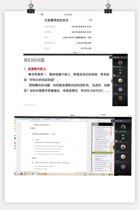 8月16日晚7:30,大学英语教学部大学英语(一)、(二)教研室通过腾讯会议召开了新学期课程建设专题工作会议。 学院副院长陈曼和教研室全体教师参加会议,会议由大英部主任万呈惠主持。