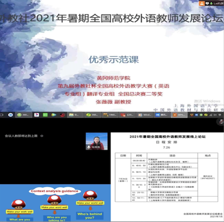 我院张薇薇老师受本次论坛组委会邀请,与来自上海海事大学、湖北大学的老师同台论道,与与会教师分享了新编大学英译汉课程示范课。