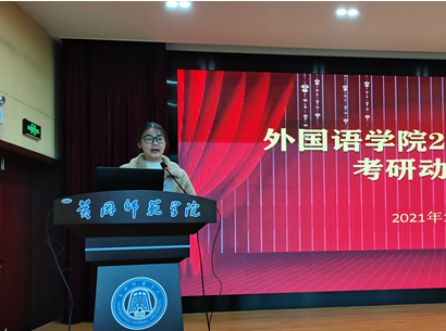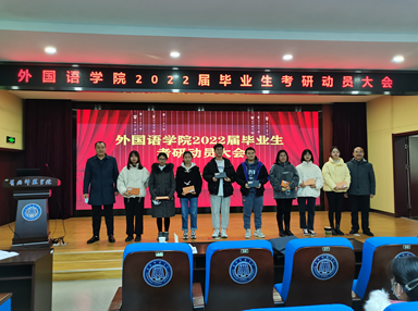 考研学生代表、英语201801班徐晨曦同学与同学们分享经验、交流心得,她认为在这最后时刻考验的就是意志力,希望大家能够坚持,也希望大家不妄自菲薄,放平心态,按照既定计划稳扎稳打的冲刺。她代表全体考研学子对学院关怀表达了感谢,并表示一定全力以赴,以最好的状态迎接考试,以优异的成绩回报学院的培养与关怀。