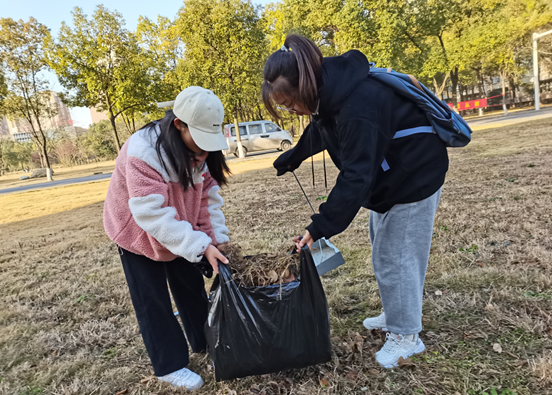 同学们相互合作,齐心协力完成落叶清扫工作。