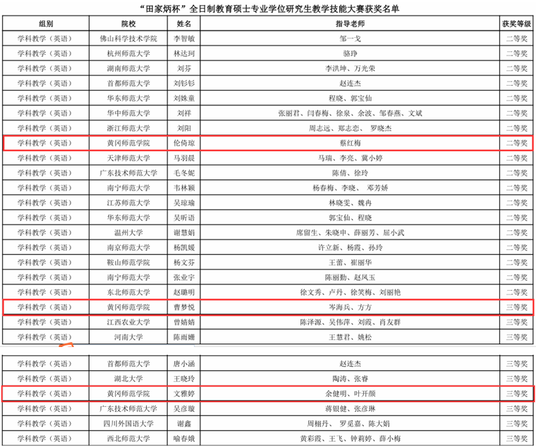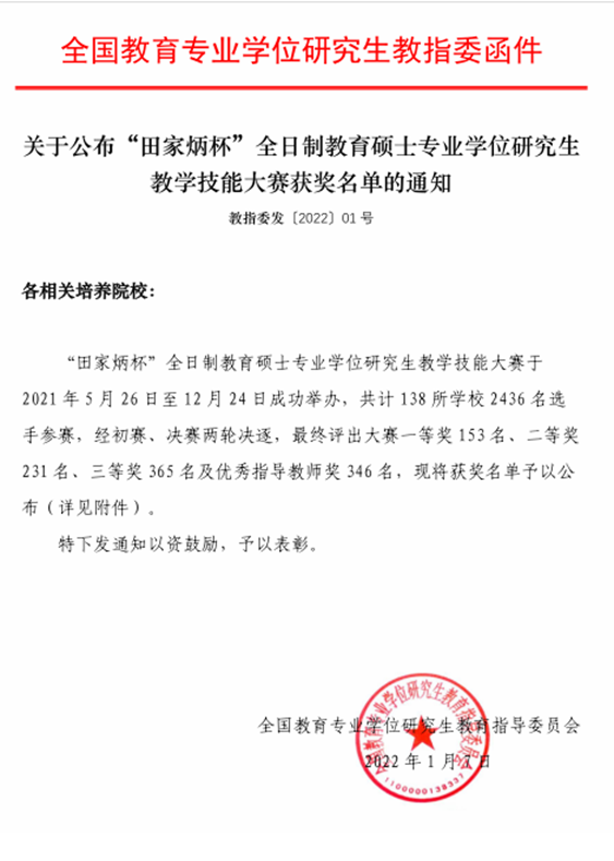 近日,全国“田家炳杯”全日制教育硕士专业学位研究生教学技能大赛决赛落下帷幕。经过激烈角逐,我院研究生脱颖而出,分别荣获二等奖1项(伦倚琼)、三等奖2项(曹梦悦、文雅婷)。