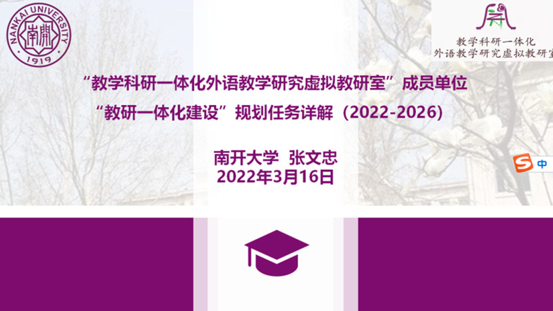 随后,南开大学张文忠教授介绍了虚拟教研室建设的总体目标与具体任务,并就虚拟教研室教研片区的初步安排作了说明。他指出,教育部教学科研一体化外语教学研究虚拟教研室将秉承“责任落实,建设到位;共建共享,共生共赢”的理念,为了每个外院、每位外语人更好的发展,将教研室建成外语教研发展共同体。