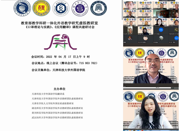 2022年4月17日上午9时,教育部教学科研一体化外语教学研究虚拟教研室课程共建研讨会于线上举行。本次课程共建研讨会天津科技大学williamhill英国召集,天津农学院人文学院、湖北师范大学、williamhill英国中文、武汉纺织大学等高校外语教研团队虚拟教研室联合主办,各校虚拟教研室负责人、团队成员齐聚云端,共同研讨《口译理论与实践》《应用翻译》课程共建相关事宜。
