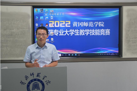 选手比赛结束后,本次竞赛特邀评委----黄冈市外国语学校名师喻书平对选手们的表现进行了总结点评。喻书平老师对参赛选手的现场展示予以了高度评价,并对每位参赛选手的表现进行了逐一点评。他指出,在教学中教师须十分注意细节的把控,如课件的内容展示、教师的口语指令等;在教学设计中应融入课程思政,实现育人于无形、润物细无声。