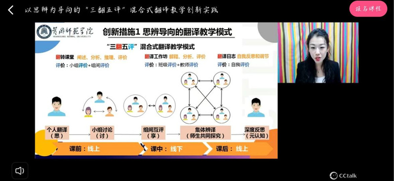 张薇薇老师从什么是思辨、为什么思辨、如何思辨、如何思辨评价等四个方面介绍了三翻五评混合式翻译教学模式的创新背景、创新理念、创新实践与创新反馈,并以《翻译技巧与实践》课程为例,展示了多义词翻译单元设计理念。讲座结束后,张老师与观众在线互动,就老师们提出的问题进行了逐一回复。一些观众在线留言表示收获颇丰,深切体会到只有教学创新才能让更多学生受益。