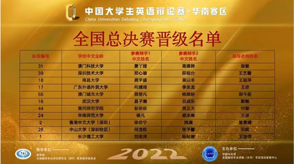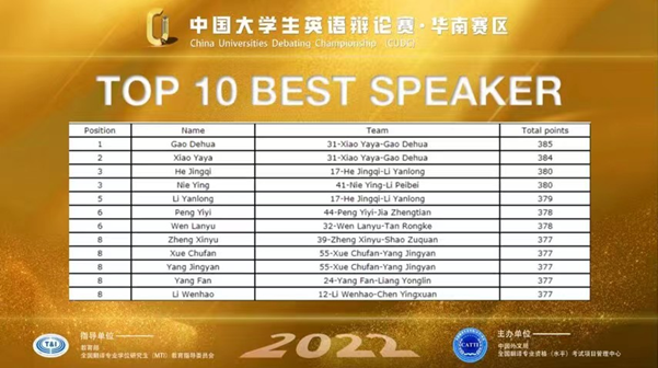 9月24-25日,2022年中国大学生英语辩论赛(CUDC)华南大区赛在线上举行。我院2020级英语专业彭依依和贾正天组成的英辩队以总排名第七的位置晋级全国总决赛,并荣获赛区一等奖,彭依依荣获“十佳辩手”荣誉。