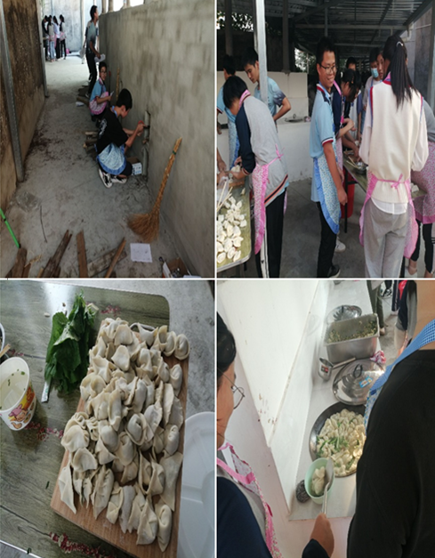 本周四,我和同学们一起参与了烹饪实践。这周的学习内容是包饺子。学校事先准备好了饺子皮和木材,其他的比如饺子馅、生火、烧水等,都要学生自己去实践。开始时,面对未处理的蔬菜和肉,大家都手足无措,不知道从何下手。洗菜,切菜,和饺子馅,手忙脚乱。好不容易和好了馅,终于可以开始包了。但是如何包,又是一个难题。有的同学干脆直接捏拢,有的同学包成了汤圆,有的同学包成了元宝。还好每组还有一个外援---家长,在经验丰富的家长的指导下,学生们渐渐掌握了方法,渐渐有了饺子的形状。与此同时,生火烧水也是难题。不少同学都难以生火,浓烟阵阵;也有同学很快掌握了方法,成功烧然了柴。整个烹饪实践过程对平时在家坐等吃饭的学生来说,都是一个新奇的体验。