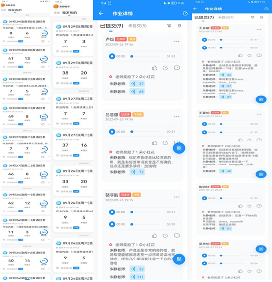 在听课之外,实习老师也给我安排了一项每日必做的任务:为两个班的孩子纠音。我会在每天放学后在“班级小管家”上发布班级作业,随后再通知家长,要求督促孩子完成录音作业,最后对自定义作业进行批改。一开始,可能因为方言的缘故,我对自己的英语口语是不太自信的,但我的实习老师常常给予我帮助和支持,这给了我比较大的鼓励。因此,我对学生也尽可能多采取鼓励的方法,不论是口头上的一句鼓励,还是在作业本上写的一句加油,又或者仅仅只是一个肯定的眼神都能给学生带来意想不到的能量,让他们对学习的情绪不是畏惧与躲避。(例如学生小G:性格偏内向,坐教室最后一排,几次作业未交而被老师惩罚,在我主动对她的一次作业的进步提出表扬和肯定后,她最终也会认真跟着老师开口说英语了。)这项任务确实是需要花费一些时间和耐心的,虽然每天都工作到很晚,但每次看到学生今天读得比昨天读得好一些时心里就会觉得一切都是值得的。
