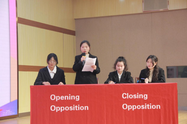 本次比赛吸引了英语专业和非英语专业的同学参加。采用的赛制是英国议会制(British Parliamentary Debate),简称BP。一场BP辩论有正、反两方。正方上院:李祎和王小熙,正方下院:胡莹盈和汪欣怡,反方上院:郭晶和林晨,反方下院:柯贤全和徐康凌,共八位辩手参与了本次辩论赛。