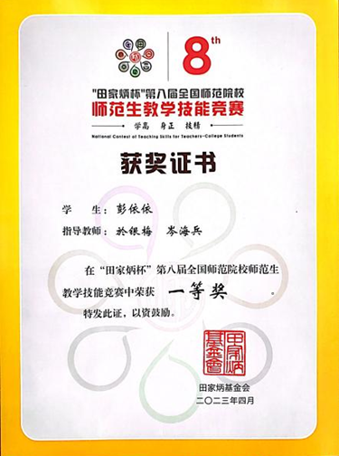 近日,“田家炳杯”第八届全国师范院校师范生教学技能竞赛决赛在浙江师范大学举行,来自全国107所院校的优秀学子齐聚芙蓉峰下,切磋技艺,展示风采。我院英语专业学生彭依依在历经学校初赛和全国复赛后,成功入围现场决赛,并在4月14日-4月16日的决赛中荣获一等奖。