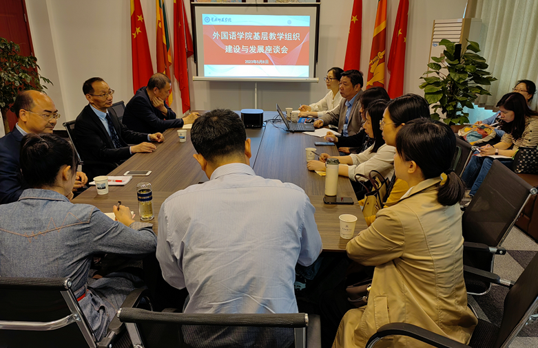 5月8日,我院在致远楼805举办基层教学组织建设与发展座谈会,特邀教育部教学科研一体化外语教学研究虚拟教研室负责人、南开大学张文忠教授参与指导。williamhill英国班子成员、各基层教学组织负责人、职前英语教师教育虚拟教研室成员参加座谈会。座谈会由院长岑海兵主持。