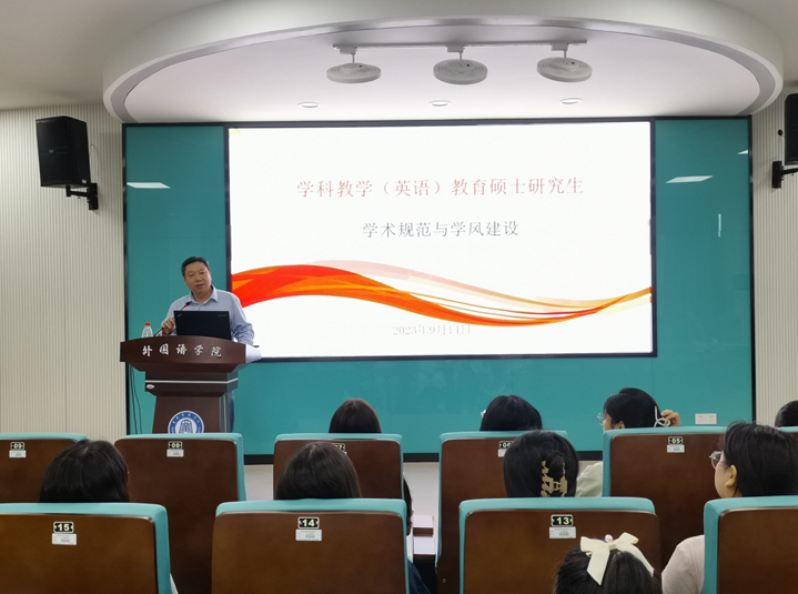 院长岑海兵致欢迎词,对全体新生表示热烈欢迎,并介绍了学院研究生教育的发展历程以及取得的成绩。他希望2023级研究生明确学科英语教育硕士的培养目标,成长为学科教学基本功扎实、教研能力突出的高层次人才,特别要牢记“国际视野、本土情怀”的理念,做到“立足地方,服务地方,走出地方”,成长为服务基础英语教育的中坚力量。