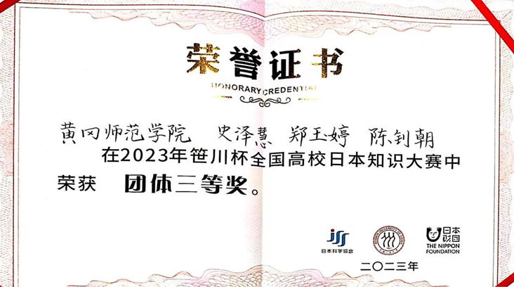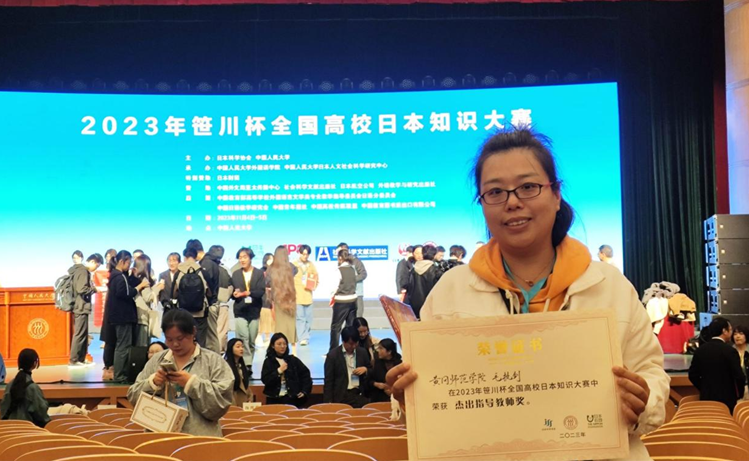 一年一度的“笹川杯”全国高校日本知识大赛于2023年11月3日-5日在中国人民大学拉开帷幕。日语专业学生史泽慧、郑玉婷、陈钊朝代表我校参赛。团体赛中,我校代表队与来自全国97所高校的代表队同台竞技,经过激励角逐,最终荣获“团体三等奖”;在个人赛中,史泽慧沉着应战,一路过关斩将,获得“个人优秀奖”。