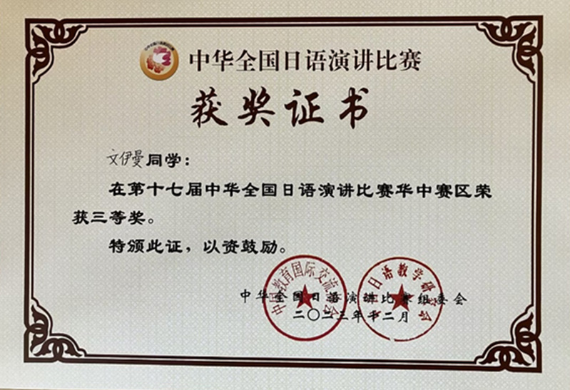 2023年12月2日,“第十七届中华全国日语演讲比赛”在华中师范大学拉开了帷幕。我院日语专业学生文伊曼代表我校参赛,与成功入围华中地区预赛的4省32所高校选手同台竞技,经过激励角逐,荣获该赛事三等奖。