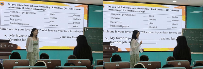 随后,我院2020级本科生彭依依展开了同课异构教学。在导入环节,她创设了“梦想音乐会”的学习情境,通过让学生完成各项课堂任务赢取音乐会门票,引入了“dream job”主题。教学中,彭依依通过一系列活动帮助学生掌握关键单词和必要的功能句型。