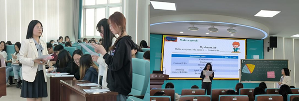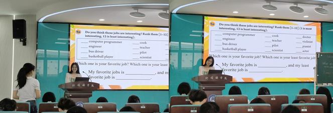 随后,我院2020级本科生彭依依展开了同课异构教学。在导入环节,她创设了“梦想音乐会”的学习情境,通过让学生完成各项课堂任务赢取音乐会门票,引入了“dream job”主题。教学中,彭依依通过一系列活动帮助学生掌握关键单词和必要的功能句型。
