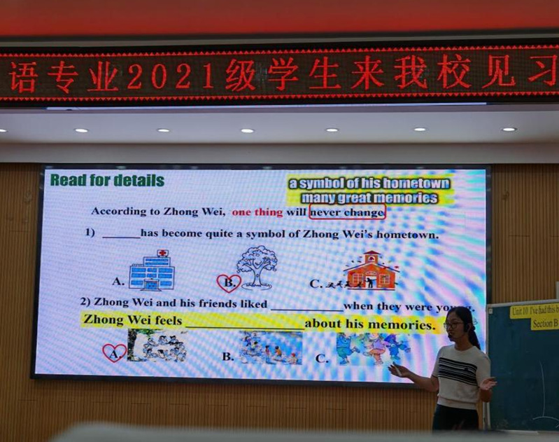 本次见习活动在黄冈市外国语学校报告厅举行,学生先后观摩了外校三名一线青年教师的英语课堂教学。