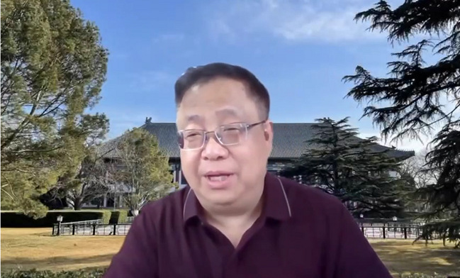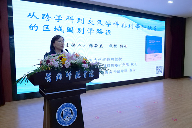(上海对外经贸大学国际商务外语学院院长、区域国别战略研究院院长张蔚磊教授作题为“从 ‘跨学科’ 到 ‘交叉学科’ 再到 ‘学科融合’ 的区域国别学路径”的主旨报告)