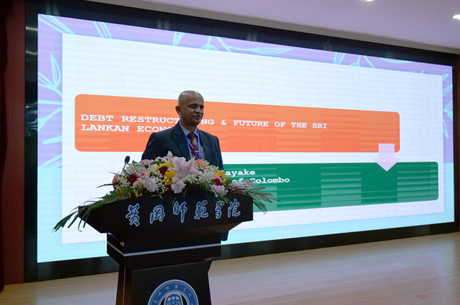 (斯里兰卡科伦坡大学经济管理学院院长尼哈尔•亨纳亚克教授作题为“Debt Restructuring & Future Of The Sri Lankan Economy”的主旨报告)