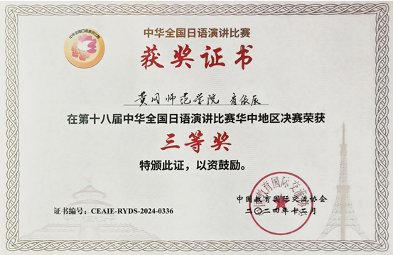 2024年12月28日,“第十八届中华全国日语演讲比赛”在华中师范大学拉开了帷幕。我院日语专业大三学生肖依辰代表我校参赛,与成功入围华中地区预赛的4省31所高校选手同台竞技,经过激励角逐,荣获该赛事三等奖。