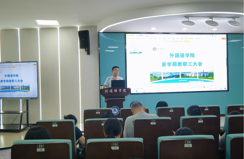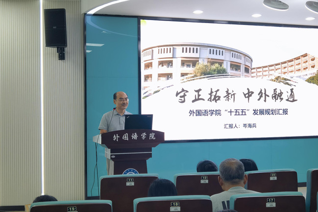 院长岑海兵回顾了学院暑期工作,对上半年工作情况进行总结分析,统筹谋划学院下半年重点工作。他指出学院要明方向、抓亮点、求协同、务实干,谱写新时代外语学科高质量发展新篇章;要提振信心、凝聚共识、全力以赴,加强内涵建设,把握教育数字化战略机遇,推动学院各项事业再上台阶。会上岑海兵作了以《守正拓新 中外融通》为题的报告,系统阐述了学院“十四五”规划完成情况及“十五五”谋划工作,厘清了学院发展理念与方向。