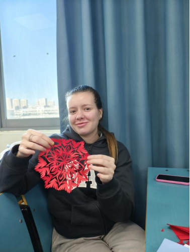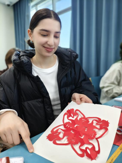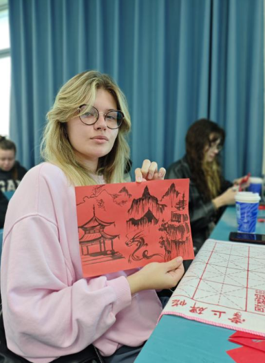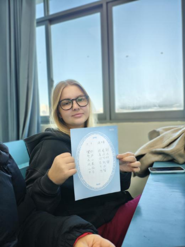 在文化实践环节,任课教师将留学生们分成四组,分别开展毛笔书写校训、喜庆剪纸创作、硬笔誊写苏轼《题西林壁》、绘制“百廿祝福画”等活动。通过将苏轼诗词与“百廿华诞”相融合,留学生们以富有创意的方式为学校建校120周年送上了真挚祝福。在参与实践的过程中,他们不仅亲身体验到黄冈深厚的历史文脉,也更加深刻地体悟到学校“力行致远”的精神传承。