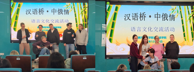 俄罗斯留学生也热情回应,Nikita Zikeev 和 Kseniia Osintseva 分别带领男生组与女生组带来吉他弹唱,展现了俄罗斯青年的艺术才华与蓬勃活力,营造出中俄文化交融的浓厚氛围。