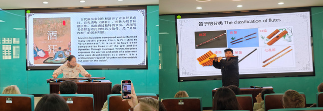 活动在悠扬的古琴声中拉开帷幕。特邀嘉宾綦小风老师依次演奏了《酒狂》《凤求凰》两首经典曲目,琴声或激越奔放,或婉转悠扬,带领现场师生沉浸于中国传统音乐的典雅韵味之中,感受古乐所承载的深厚文化底蕴与浪漫情怀。随后,虞嘉睿同学带来笛子独奏,通过《白蛇传》《九儿》《珊瑚颂》三首风格各异的曲目,展现了笛声千变万化的表现力,引发现场阵阵掌声。